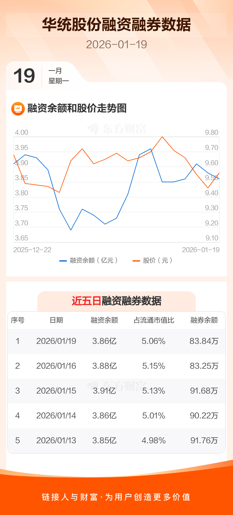 交易所最新数据显示,华统股份于2026年1月19日获融资买入531.72万元,融资偿还795.77万元,当日融资净偿还264.05万元。目前,该股融资余额3.86亿,占流通市值比例为5.06%。
