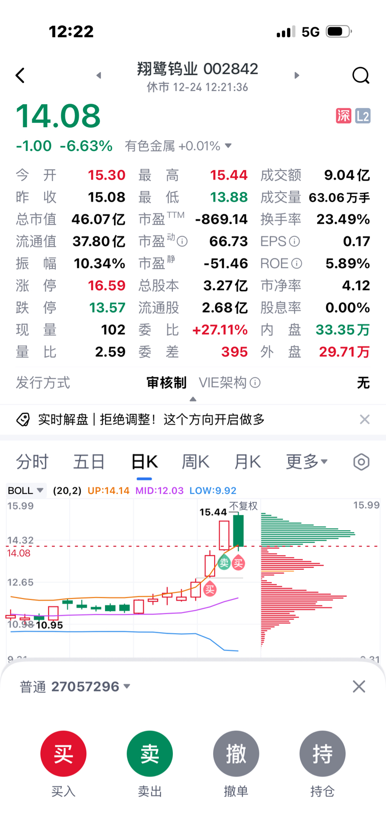 $翔鹭钨业(SZ002842)$ 昨晚上还在郁闷的要死,还在想着连板,昨天涨停板都走了,没想到真没想到今天下杀这么深,我又来下。估计今天水下捞起机会很渺茫了,整个钨板唯有江钨红着,其它都深绿。
