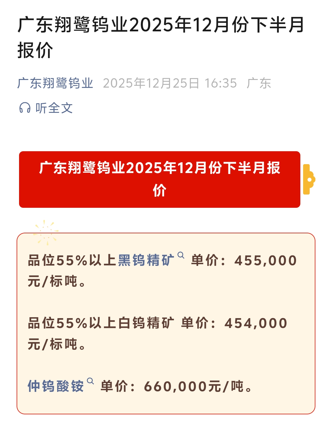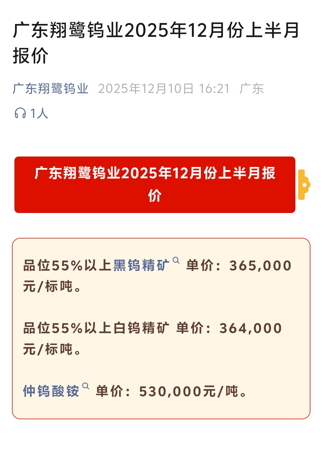 翔鹭钨业12月下半月长单价钨矿报价涨价9万,仲钨酸铵涨价13万