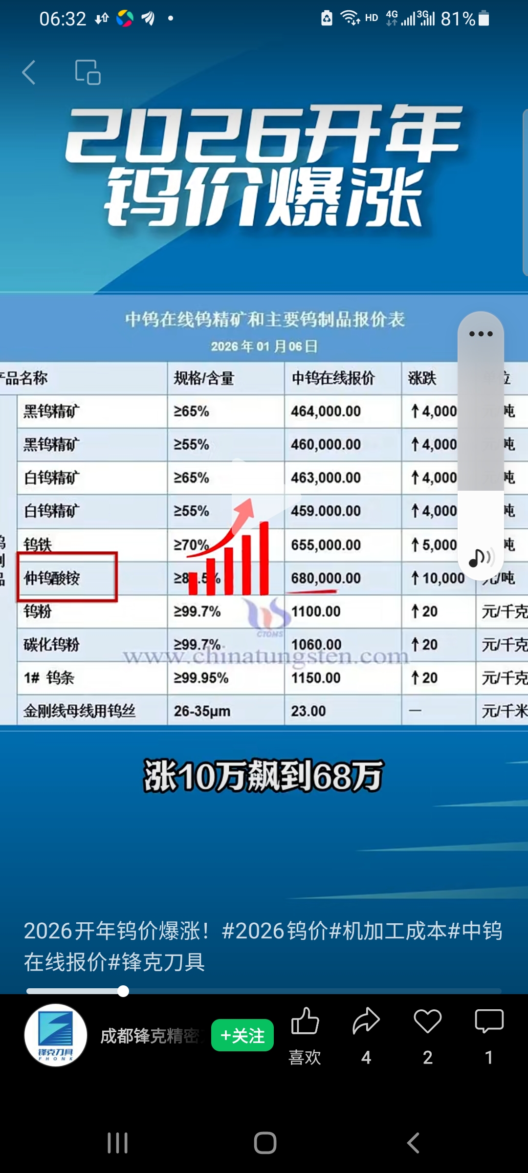 $翔鹭钨业(SZ002842)$ 2026年1月6日钨价格