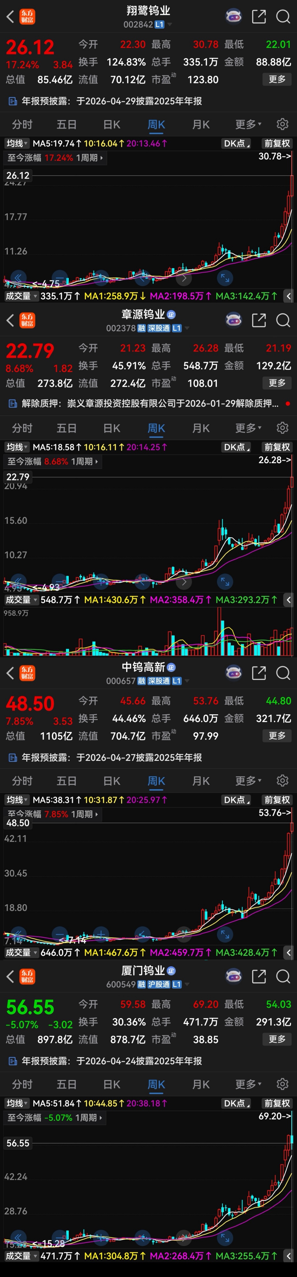 * 业绩预告滞后: 很多公司的年报预告(如厦门钨业、中钨高新)显示的还是之前的利润水平。