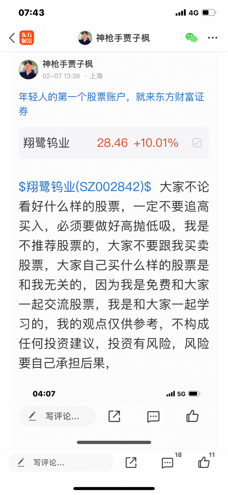 $翔鹭钨业(SZ002842)$ 这个是我二月七号发表文章看涨的股票,大家不要追高买入,必须要做好高抛低吸,我是不推荐股票的,大家不要跟我买卖股票,大家自己买什么样的股票是和我无关的,因为我是免费和大家一起交流股票,我是和大家一起学习的,我的观点仅供参考,投资有风险,风险要自己承担后果,