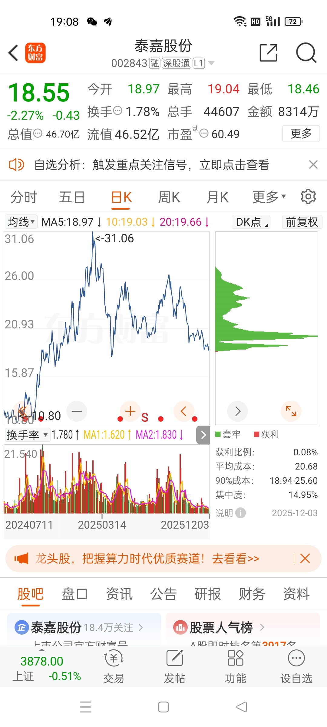 $泰嘉股份(SZ002843)$ 筹码锋都绿成啥样了,这么小的盘子,出点钱就能拉涨停了,全A就只有一个主力做泰嘉吗,没游资和其他主力看一眼泰嘉?