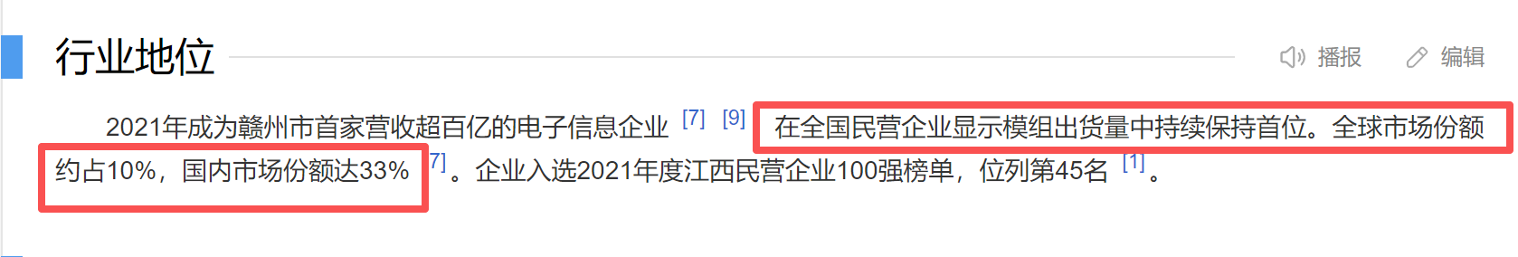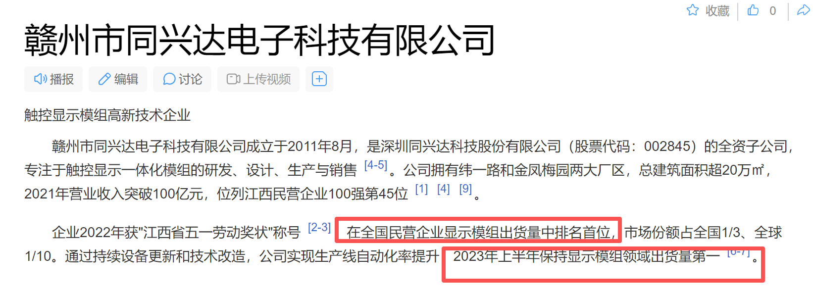赣州市同兴达电子科技有限公司,主营:触控显示模组,在全国民营企业显示模组出货量中排名首位,市场份额占全国1/3、全球1/10。