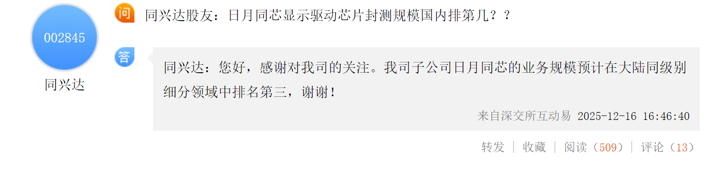 日月同芯,主营:显示驱动芯片封测 ,我司子公司日月同芯的业务规模预计在大陆同级别细分领域中排名第三。