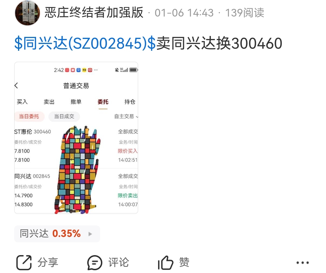 $同兴达(SZ002845)$ 恭喜买入300460的兄弟们,你们的收益炒股百分之九十的人