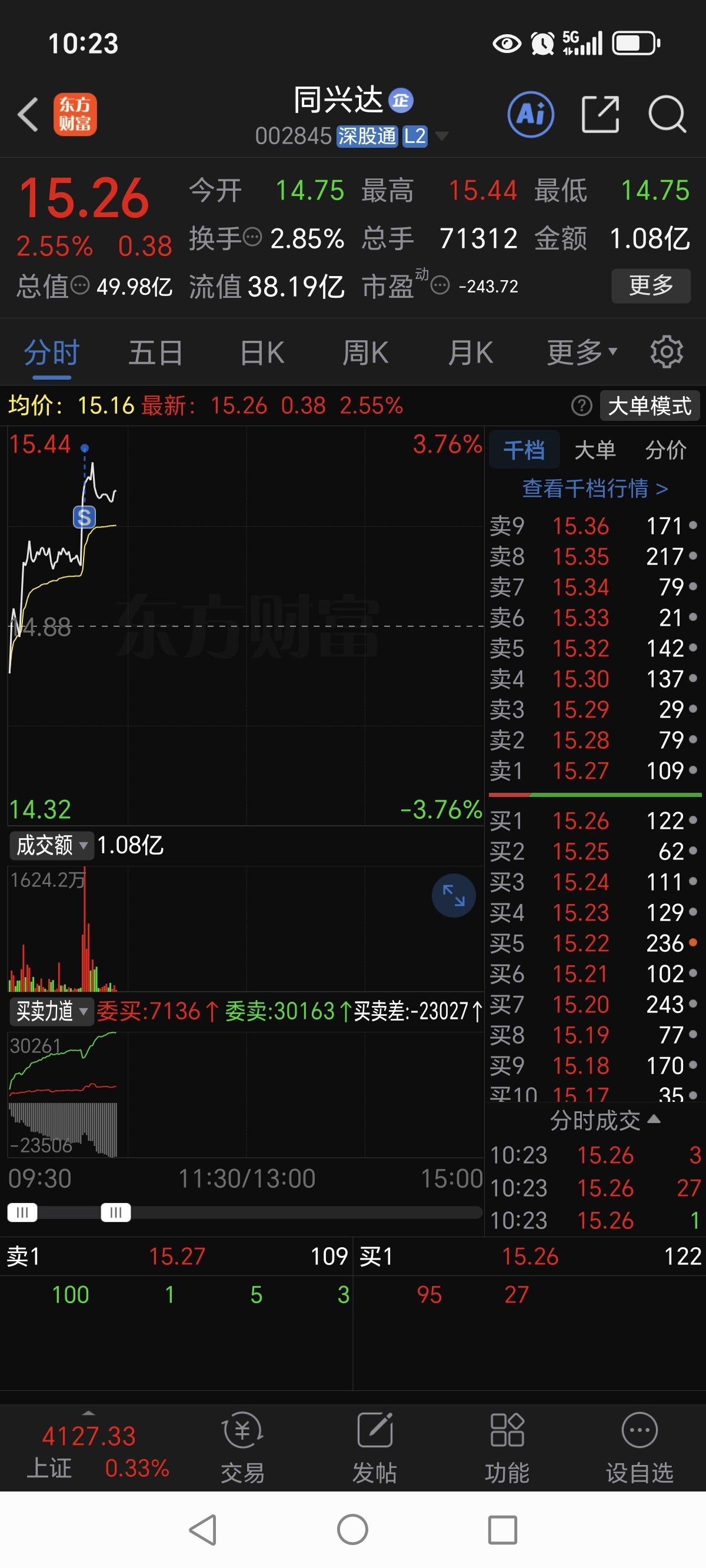 $同兴达(SZ002845)$ 我15.38卖了。缺口压力位!你们玩吧