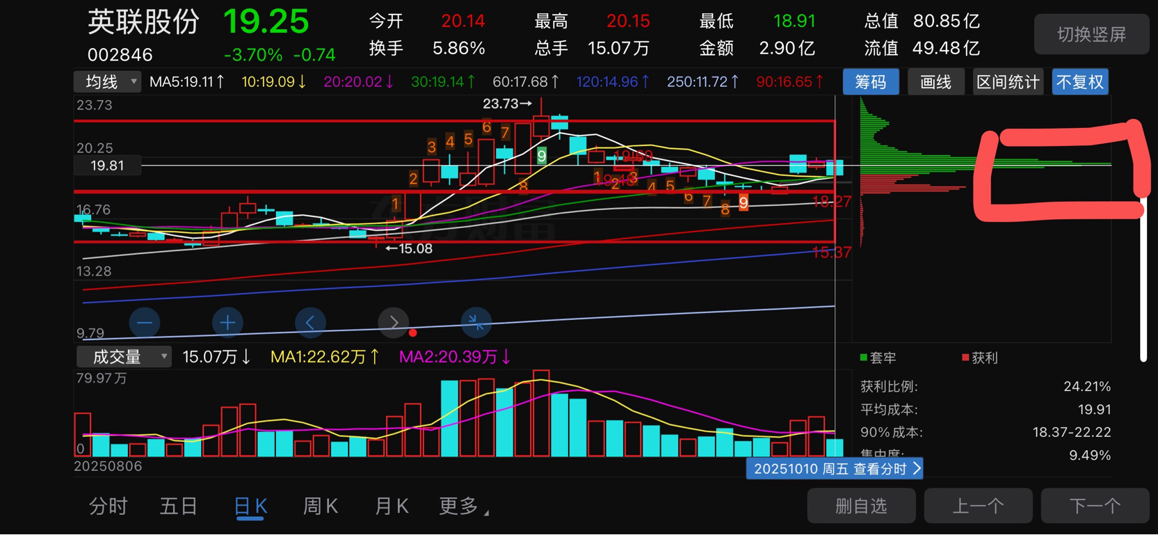 $英联股份(SZ002846)$ 筹码已经上移了,主力成本我估计也就19.93~19.7左右。今天很可能是要砸的黄金坑,把昨天意志不坚定的获利盘都自洗出去,除非今天直接核按钮,那就都别玩儿了。否则今天跌我觉得是好事儿,有5日线和10日线支撑,不用害怕