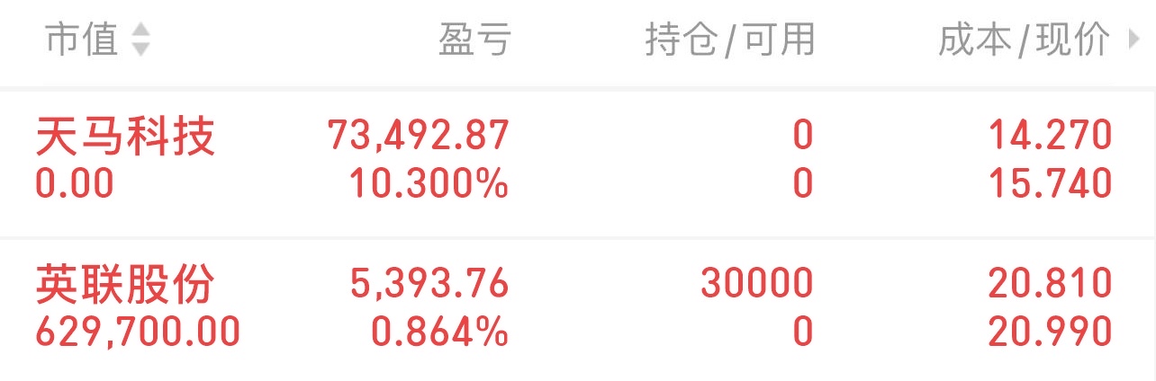 $英联股份(SZ002846)$ $天马科技(SH603668)$ 入了,明天冲高就走