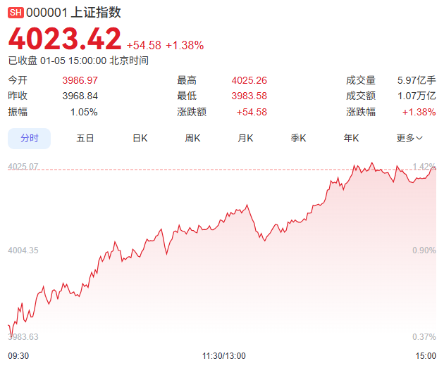 2026年A股首个交易日迎来开门红,三大指数高开高走,上证指数重回4000点,收盘报4023.42点。