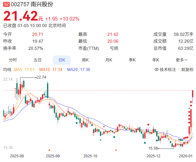从二级市场的表现来看,南兴股份更受资金关注。2025年12月30日,南兴股份迎来了自2025年8月以来的首个涨停板,并在后续的两个交易日连续涨停,实现3连板。