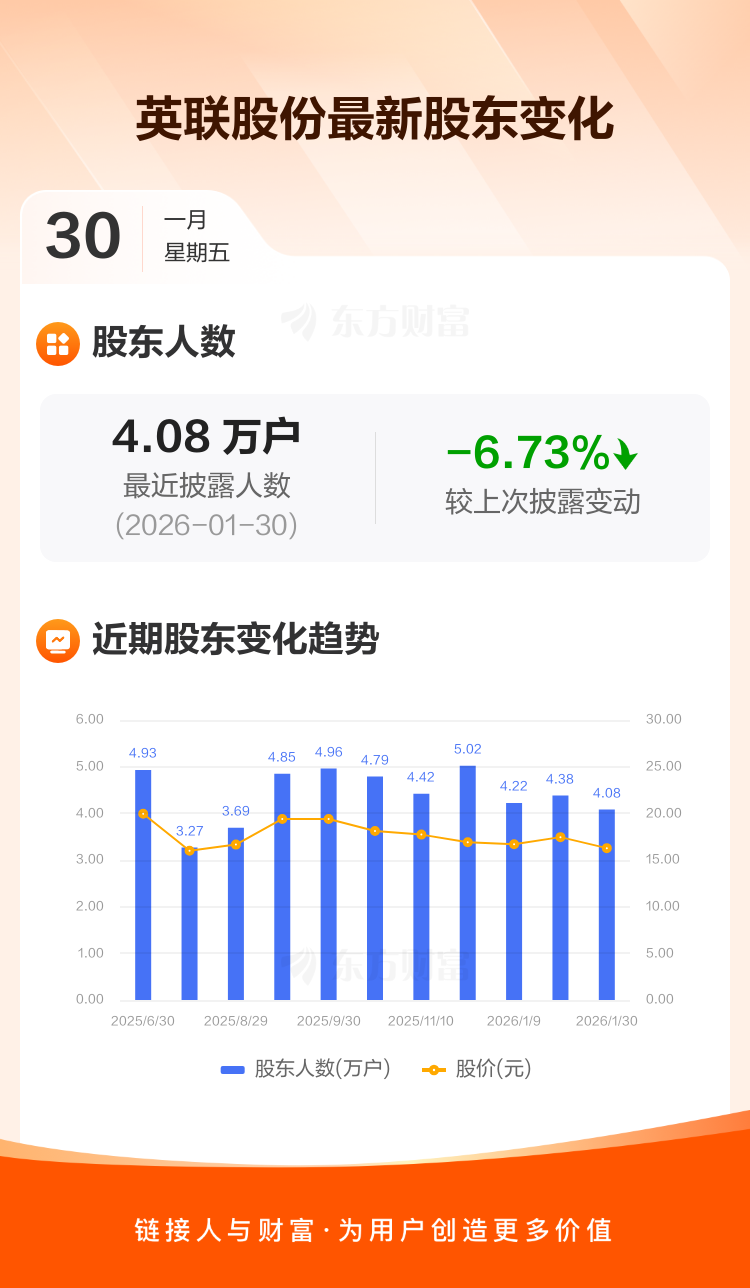 英联股份:截至1月30日最新股东户数4.08万户,较上期减少6.73%