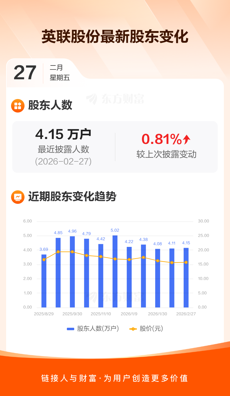 英联股份:截至2月27日最新股东户数4.15万户,较上期增加0.81%
