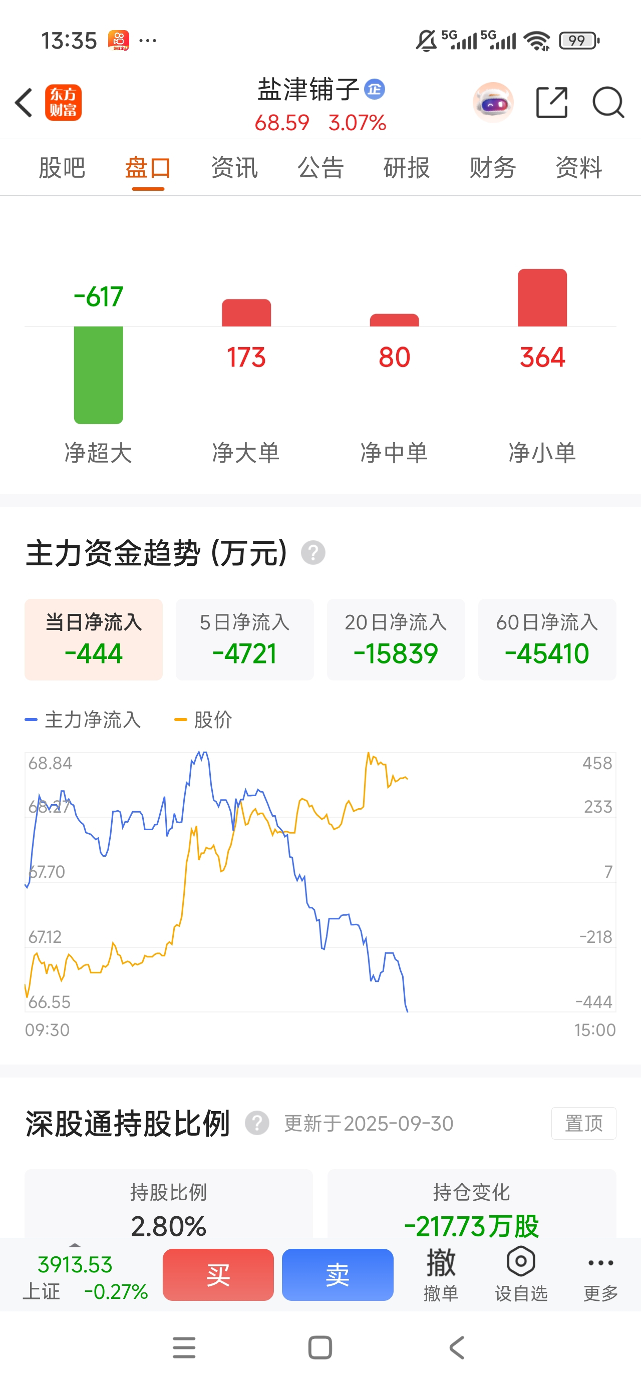 $盐津铺子(SZ002847)$ 主力在卖,股票上涨?