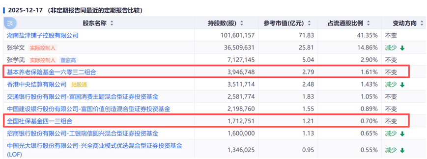 休闲零食企业盐津铺子获长期坚守,养老金一六零三二组合、社保基金四一三组合持有时间均超两年。截至2025年12月17日,两只产品分别持有394.67万股、171.28万股,持股市值分别约2.79亿元、1.21亿元,持股数量较2025年三季度末均未变化。