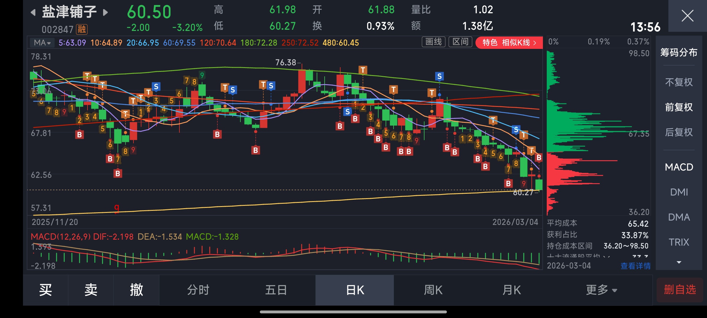 $盐津铺子(SZ002847)$ 完蛋了,满仓着一股跌将近十块钱