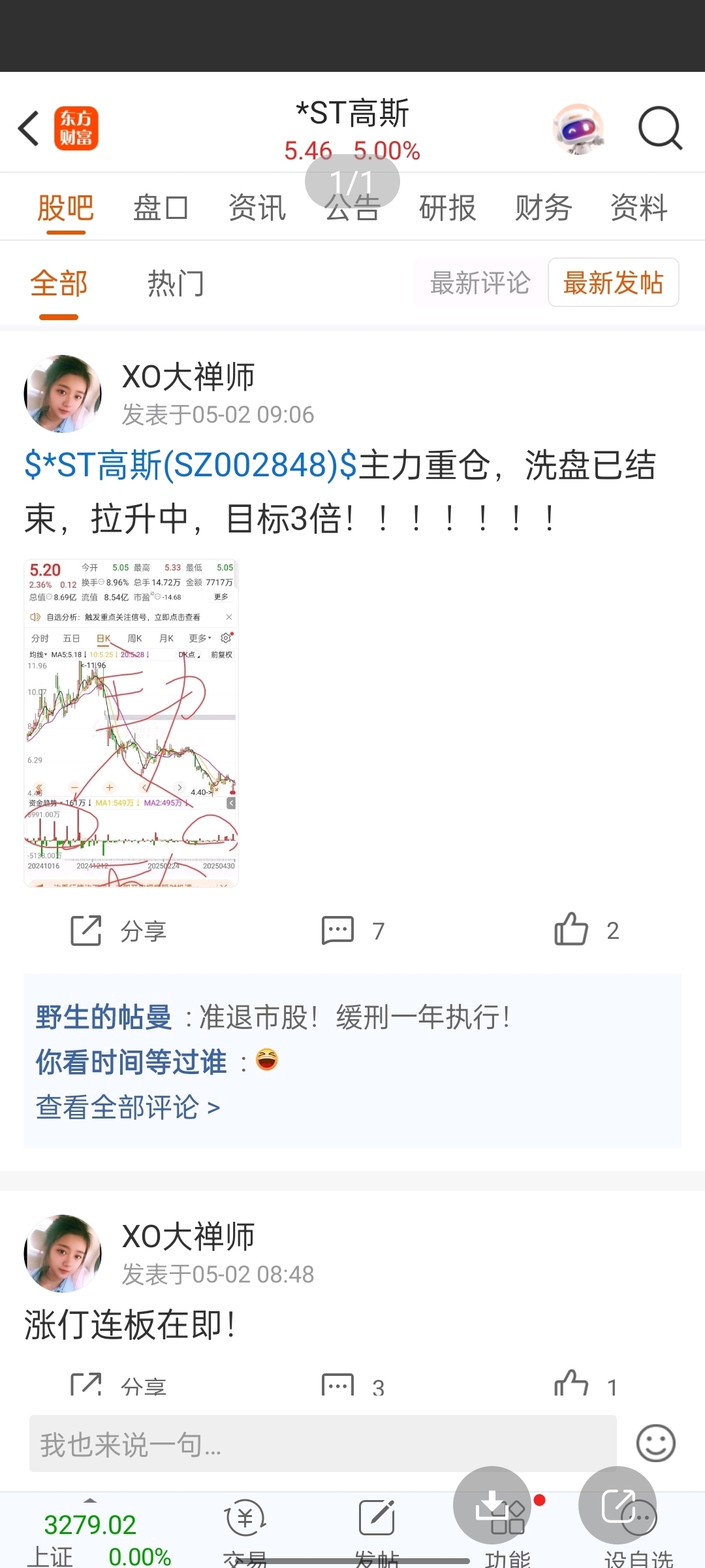 $*ST高斯(SZ002848)$ 5月2日的贴,服不股!