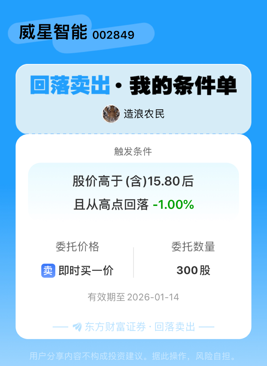 #条件单交流# #回落卖出晒单# 一位股神设置了一个回落卖出条件单,接下来就是见证奇迹的时刻~$威星智能(SZ002849)$