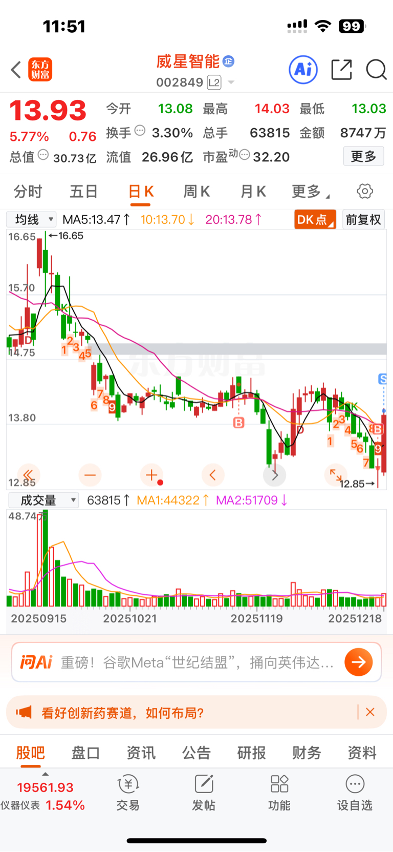 $威星智能(SZ002849)$ 被套了快一个月,昨天在低点加了波仓,今天吃了五个点顺利解套