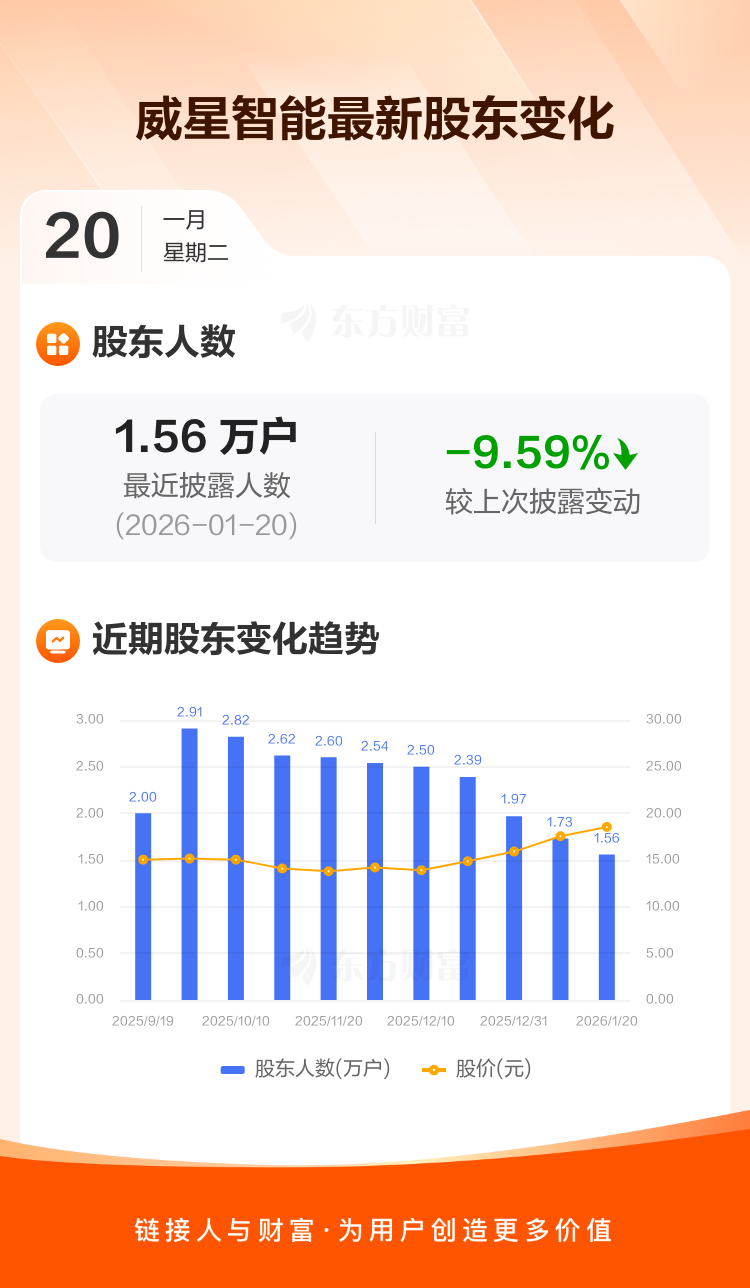 威星智能:截至1月20日最新股东户数1.56万户,较上期减少9.59%