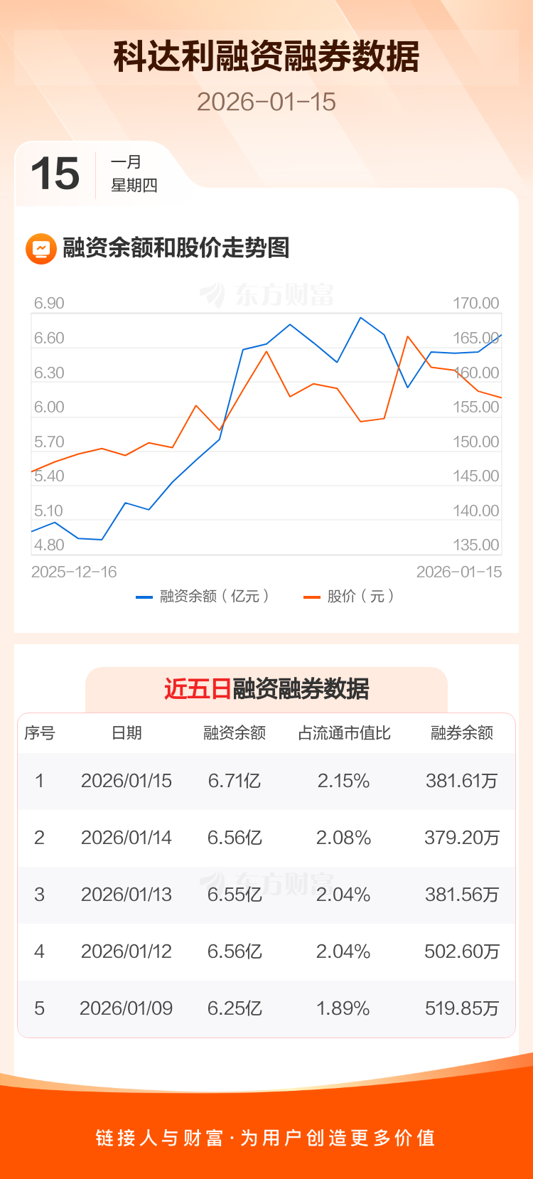交易所最新数据显示,科达利于2026年1月15日获融资买入6618.22万元,融资偿还5086.85万元,当日融资净买入1531.38万元。目前,该股融资余额6.71亿,占流通市值比例为2.15%。
