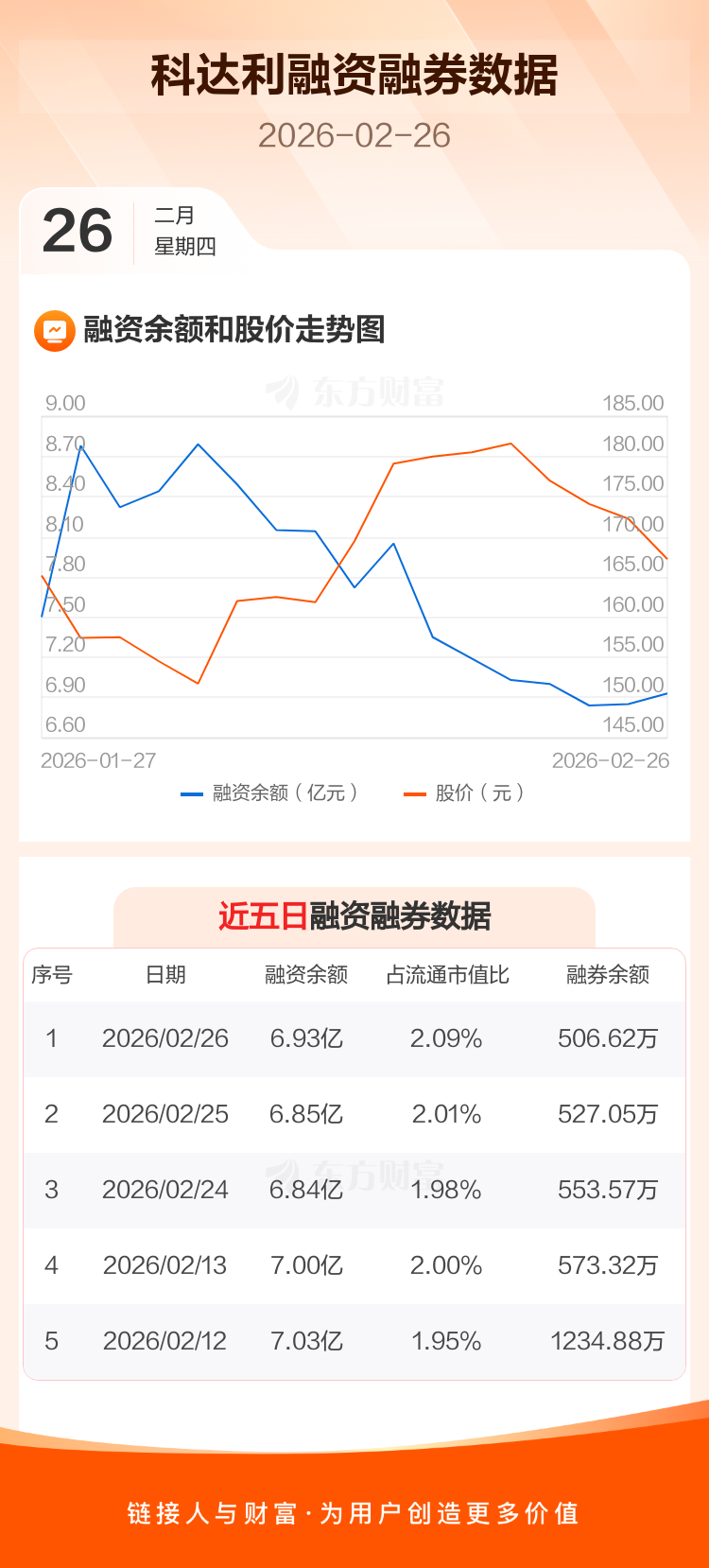 交易所最新数据显示,科达利于2026年2月26日获融资买入7413.81万元,融资偿还6637.52万元,当日融资净买入776.29万元。目前,该股融资余额6.93亿,占流通市值比例为2.09%。