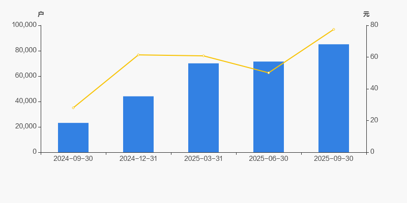 自2024年9月30日以来,公司股东户数连续4期上涨,截至目前增幅为267.76%。2024年9月30日至2025年9月30日区间股价上涨176.56%。