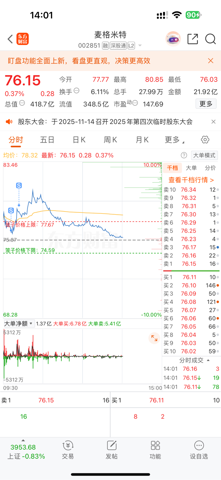 $麦格米特(SZ002851)$ 早盘卖飞了,忍住了没补,73再接回来