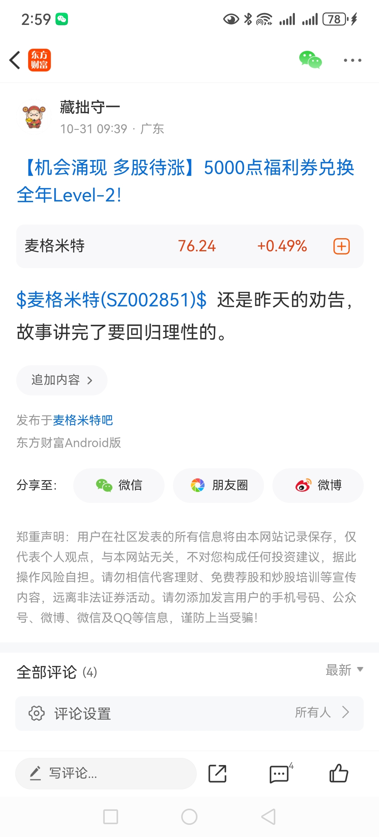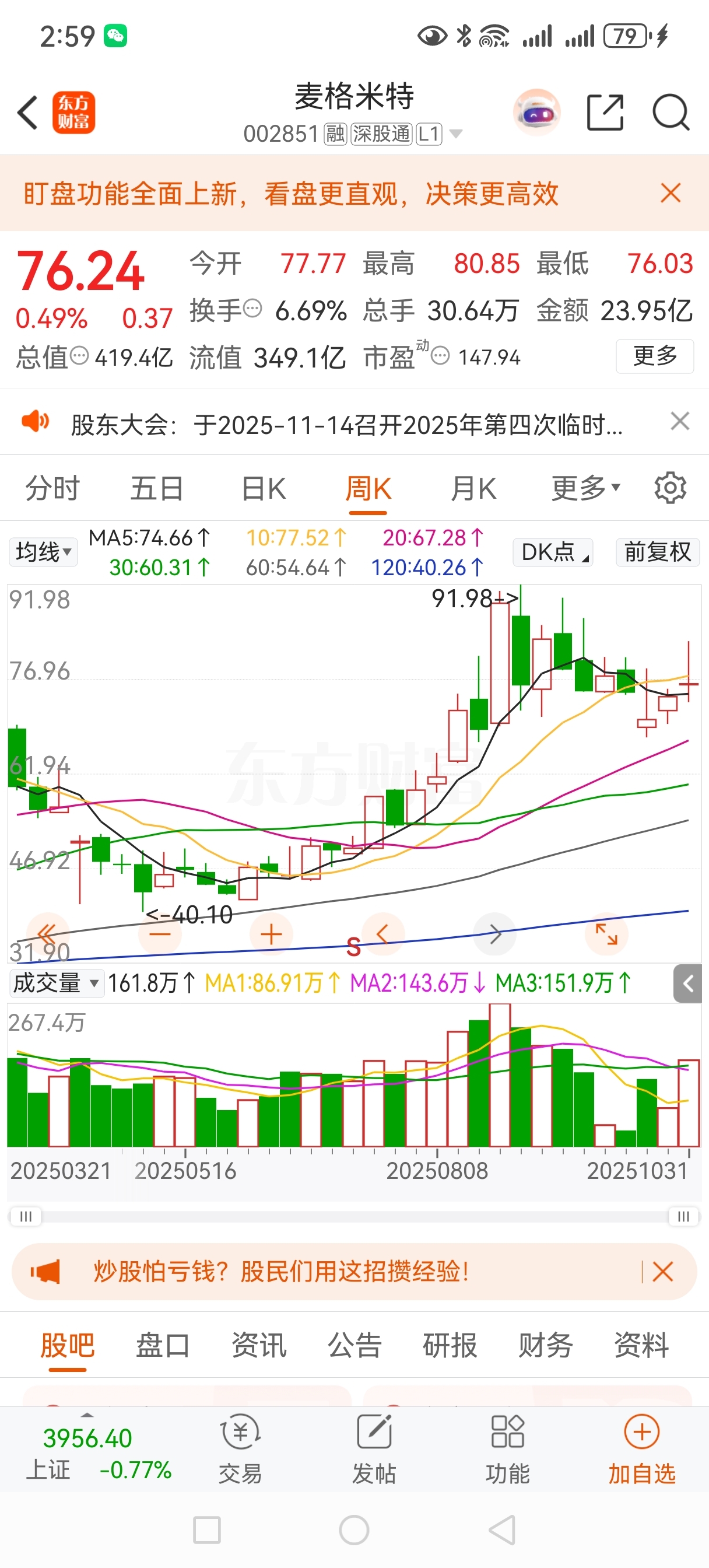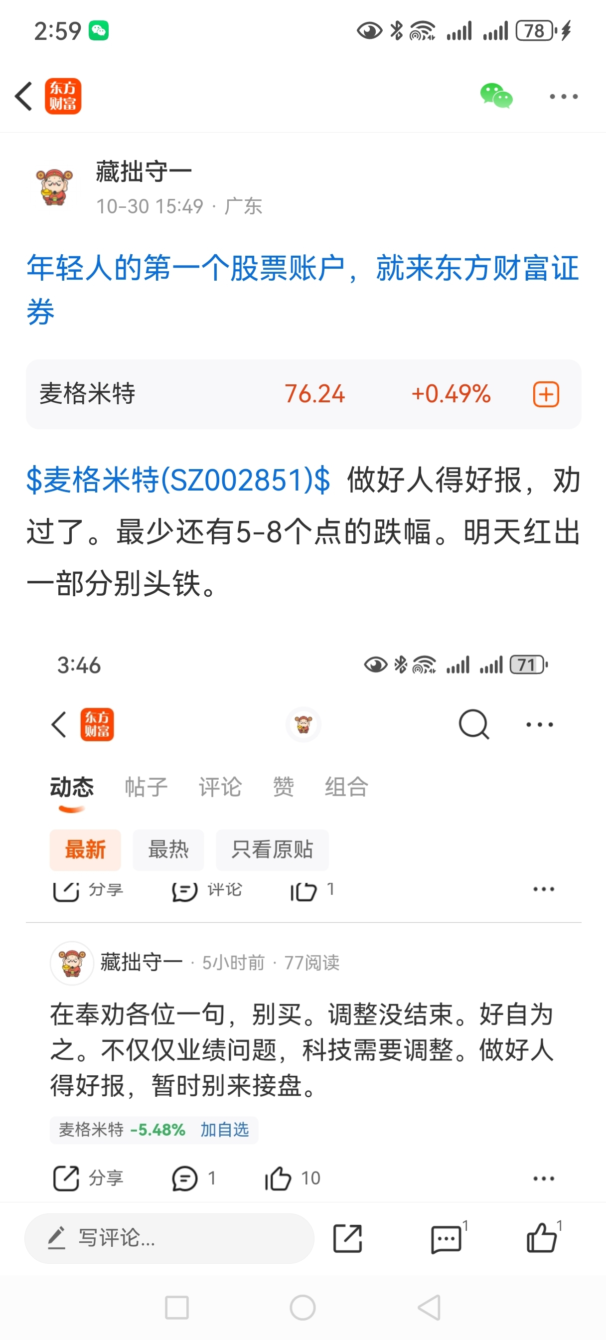 $麦格米特(SZ002851)$ 做好人得好报。毕竟很看好的一个股,毕竟一起战斗过,提示风险,提醒一下大家风险。没想到遭到辱骂。短期不会在这里乱说了。周线巨量上影线,你们自己都不是小白了,不多说了。到一定点位我会买回来。祝君好运。