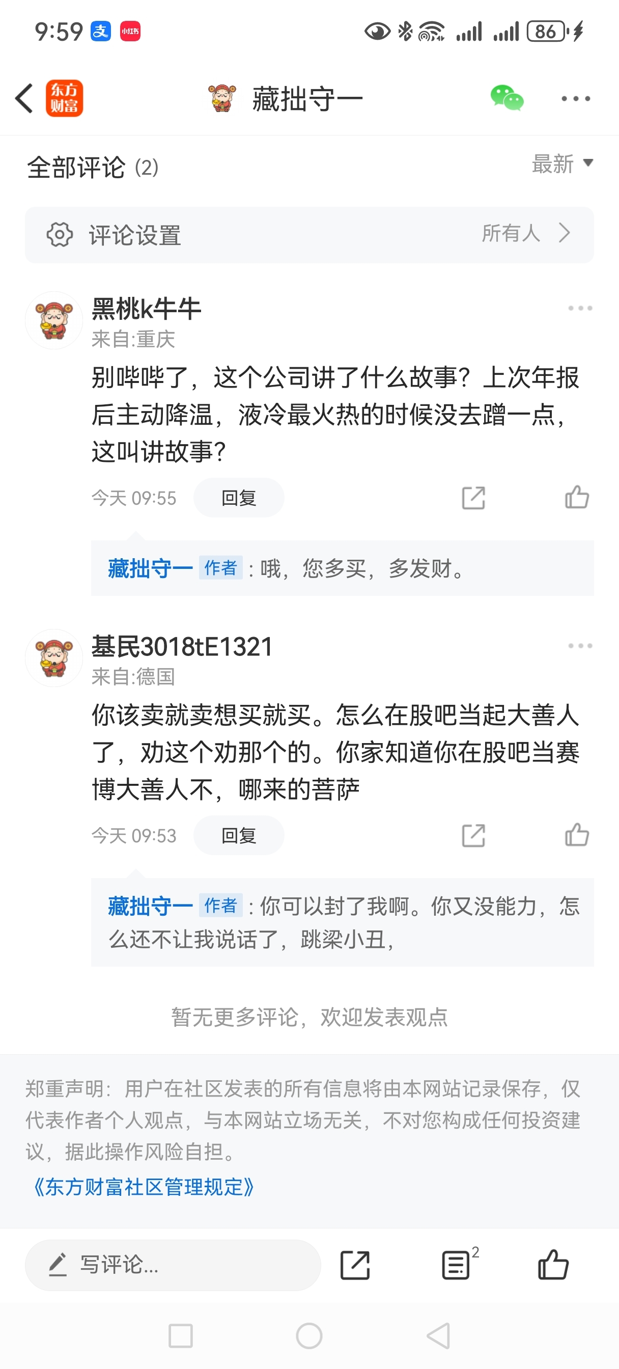 温馨提示: 1.根据《证券法》规定,禁止编造、传播虚假信息或者误导性信息,扰乱证券市场;2.用户在本社区发表的所有资料、言论等仅代表个人观点,与本网站立场无关,不对您构成任何投资建议。用户应基于自己的独立判断,自行决定证券投资并承担相应风险。《东方财富社区管理规定》