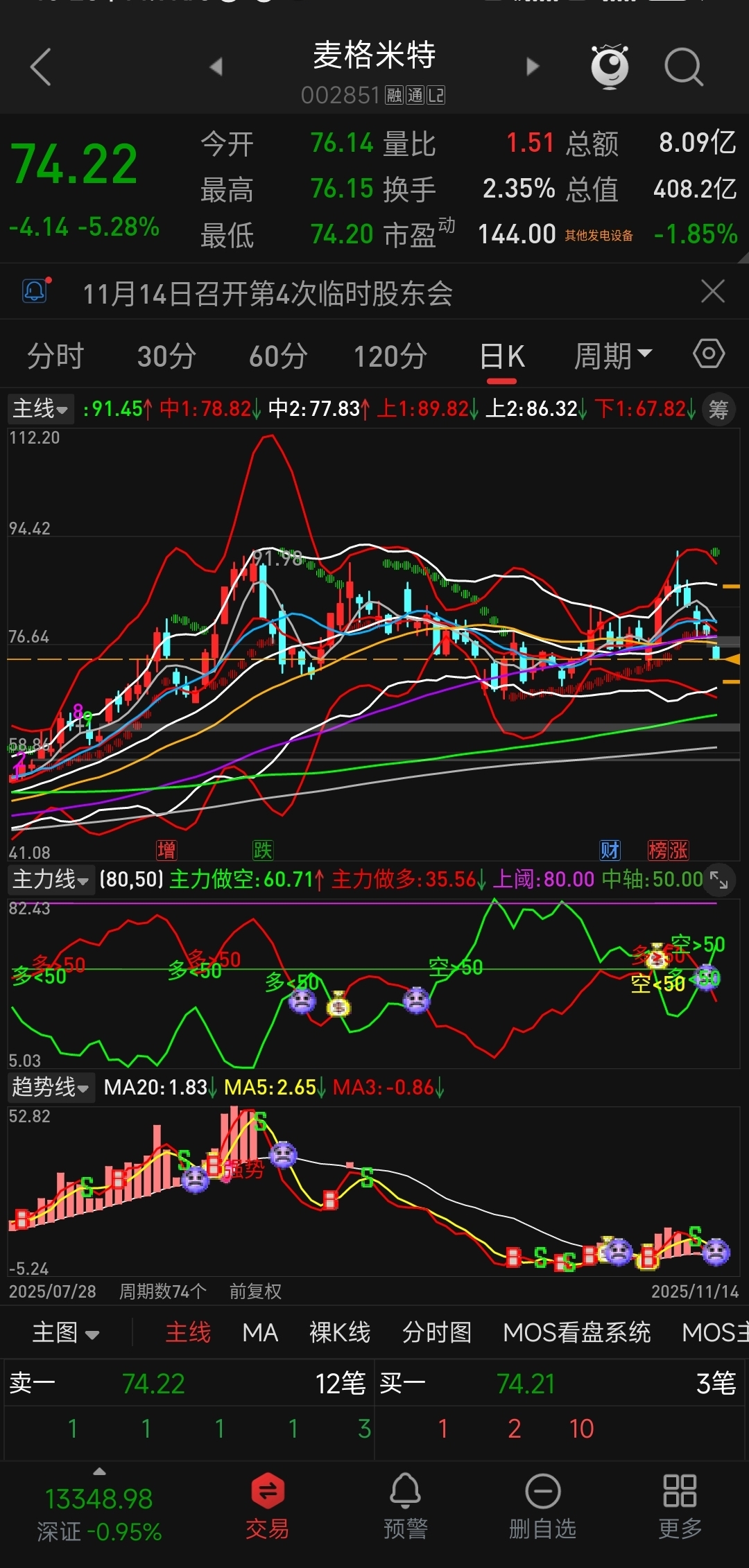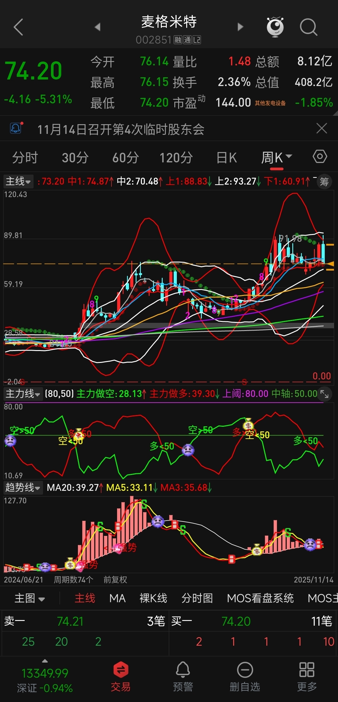 日线:向下开口,主力线、趋势线死叉。周线:进一步收口,上轨压制极强。主力线、趋势