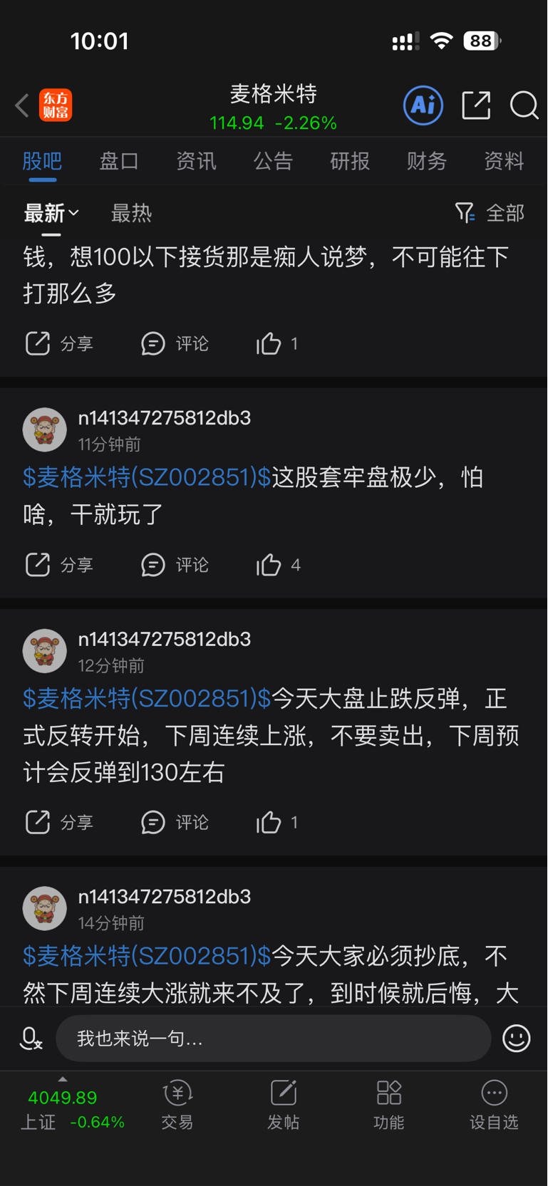 温馨提示: 1.根据《证券法》规定,禁止编造、传播虚假信息或者误导性信息,扰乱证券市场;2.用户在本社区发表的所有资料、言论等仅代表个人观点,与本网站立场无关,不对您构成任何投资建议。用户应基于自己的独立判断,自行决定证券投资并承担相应风险。《东方财富社区管理规定》