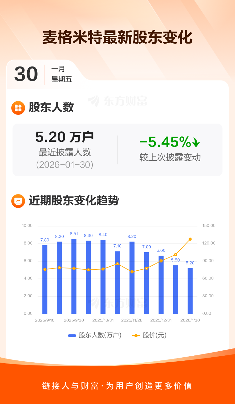 麦格米特最新披露数据显示,截至1月30日公司股东户数为5.20万户,较上期(2026年1月9日)减少3000户,降幅为5.45%。户均持有流通股数量由上期的8324股上升至8806股,户均持股金额由上期的83.92万元增加至112.00万元。