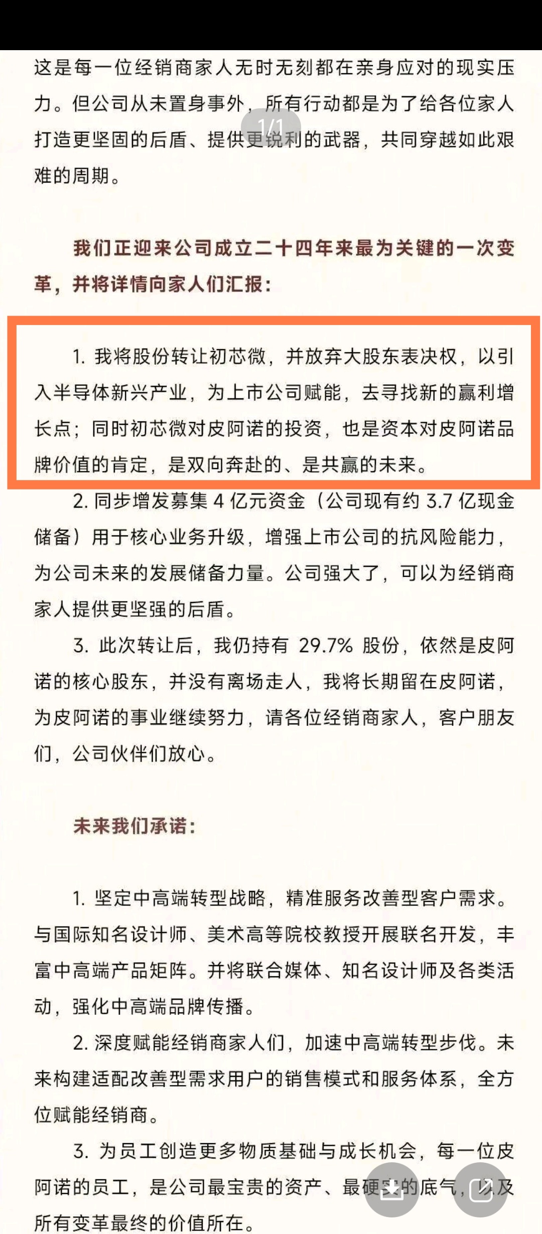 $皮阿诺(SZ002853)$ 董事长明确说了,放弃投票权,引入半导体产业。