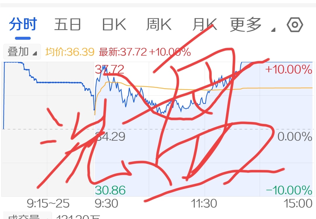 回到盘面,周五西施一站,堪比四渡赤水之战,教科书级别的经典战役,由于我复盘到位,格局到位,准备工作到位,所以就完美收获西施给我送来的12个大馒头,开盘直接高开超预期,我复盘是预判他低开,所以就没入,我想在等他回踩到水下再入,结果直接拉起,速度很快放量拉升,来不及多想连忙挂单,挂几次都没抢到,直到36元才抢到,如果我竞价就可以多抓三个点大馒头,这也是我经常说的我入不到最低点,原因也就在这里,当时还有人说我买的太晚了,哈哈哈哈,我也承认这一点,因为前几次都是大幅低开,我也在观望等他跌下来买加。然后等他拉升,我在他拉到37.5时候就把加仓的卖出去,一股赚1.5,太爽了就几分钟时间,卖出以后继续观察,当时有两种可能,一种就是直接封板,那么就要早下班了,战斗结束了,这是一渡赤水。第二种就是掉头向下。