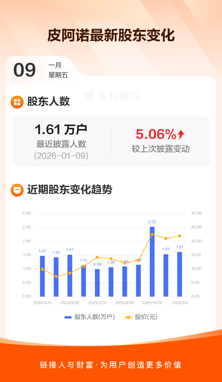 皮阿诺:截至1月9日最新股东户数1.61万户,较上期增加5.06%