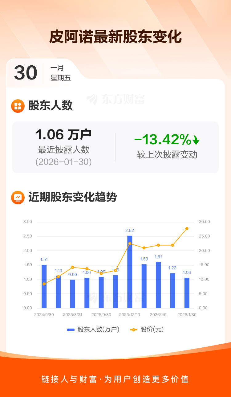 皮阿诺:截至1月30日最新股东户数1.06万户,较上期减少13.42%