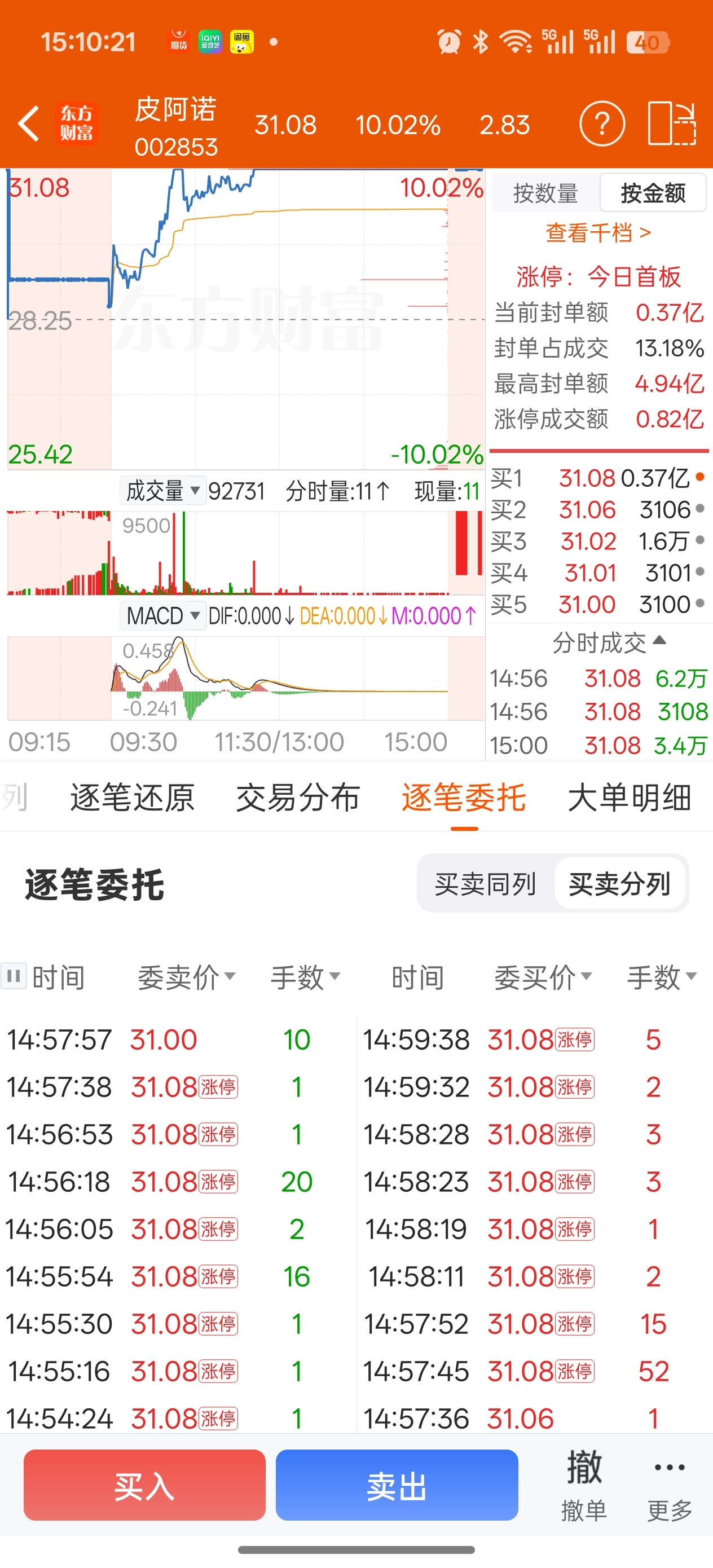 $皮阿诺(SZ002853)$ 尾盘是哪个大聪明挂了11手卖单 成交3.4万