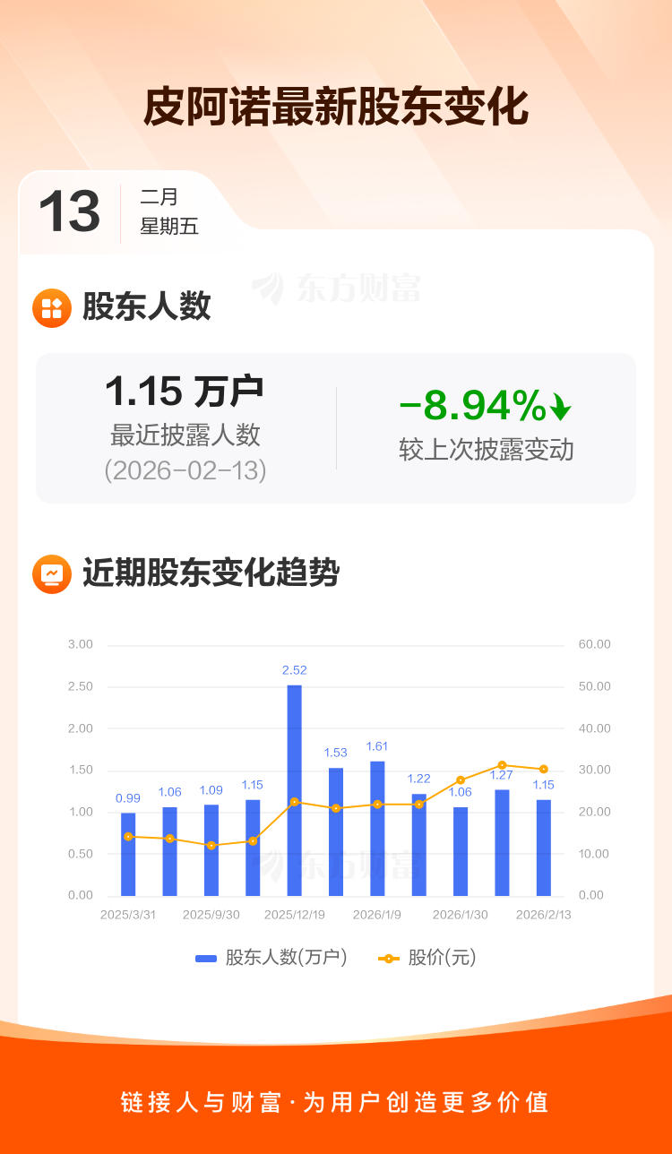 皮阿诺:截至2月13日最新股东户数1.15万户,较上期减少8.94%