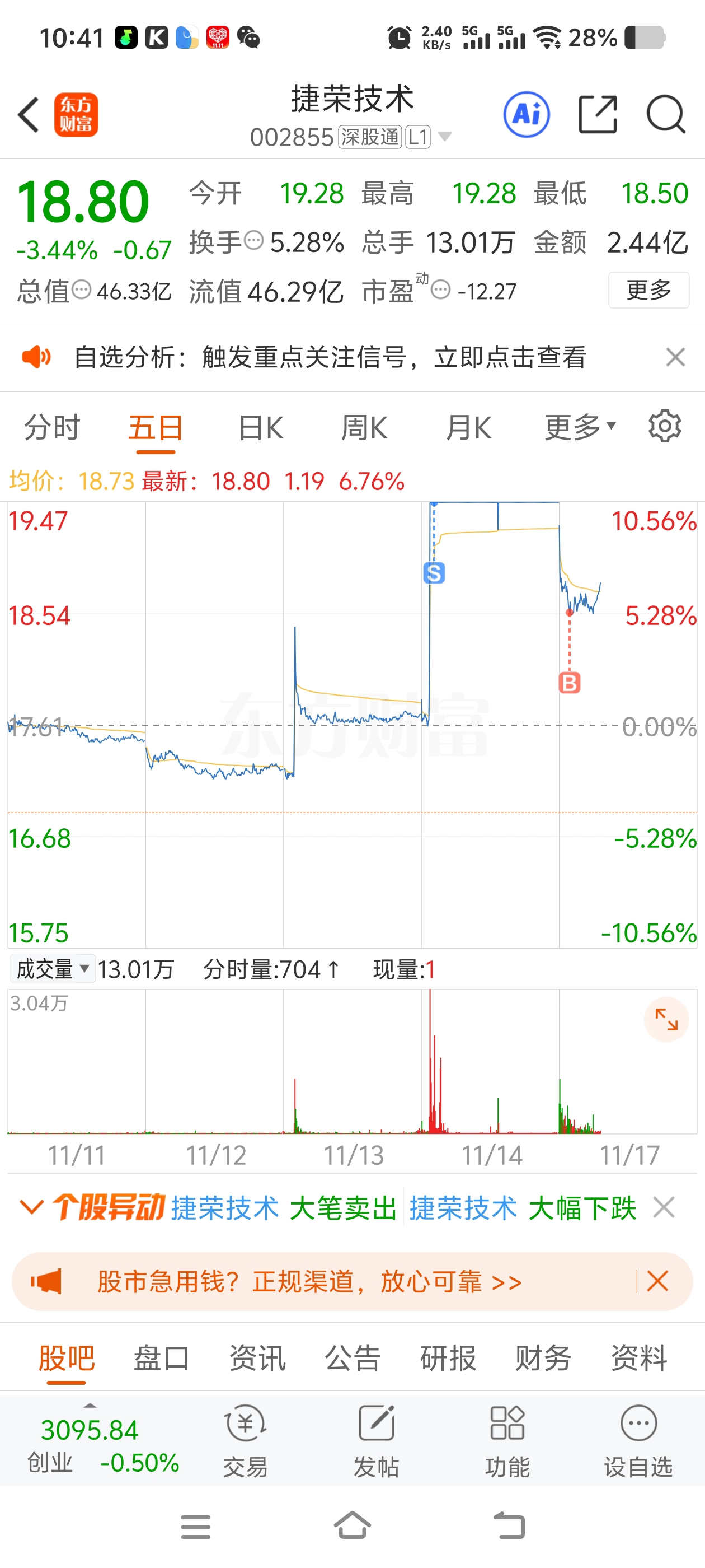 $捷荣技术(SZ002855)$ 周五走了一半,今天又接回来了