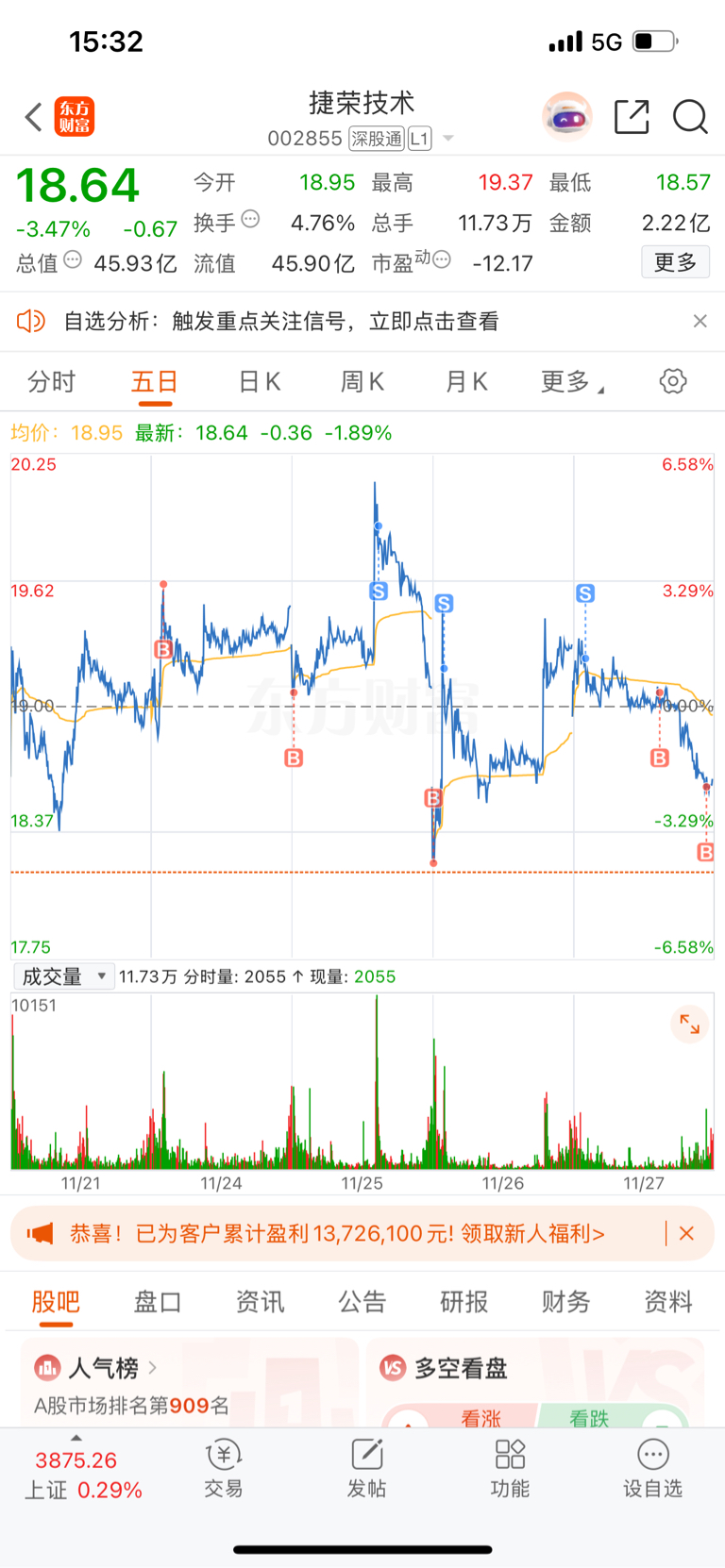 $捷荣技术(SZ002855)$ 有点着急了,明知道今天会跌到18.7左右