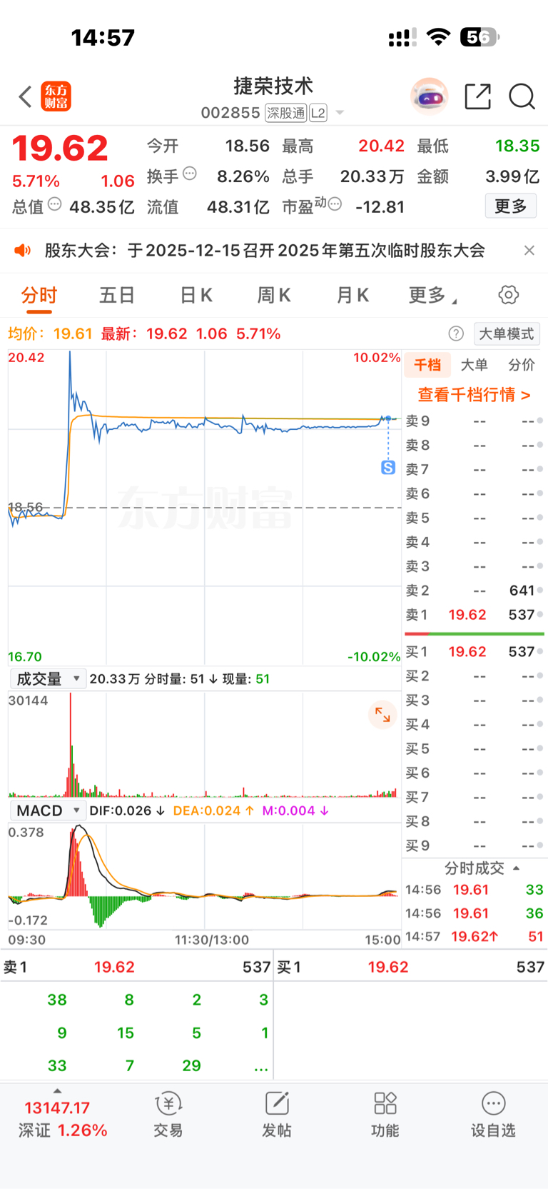 $捷荣技术(SZ002855)$ 想着你涨停量不够,必须炸板补量然后再回封,所以涨停也没卖,还是太贪了一点!今天放量突破19.47涨停价,走势良好,但上影线太长说明上方压力还是很大,等你调调再来……