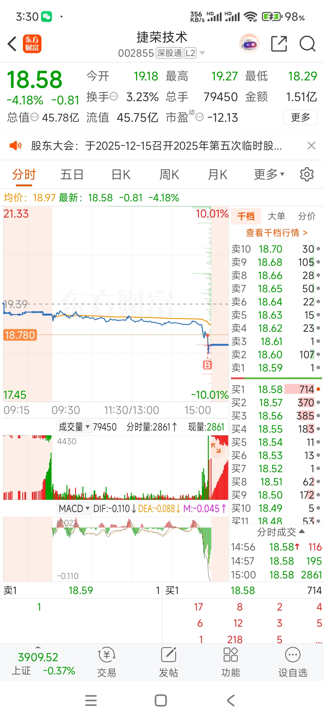 $捷荣技术(SZ002855)$ 尾盘买入还能跌一个点,明天不会废了把
