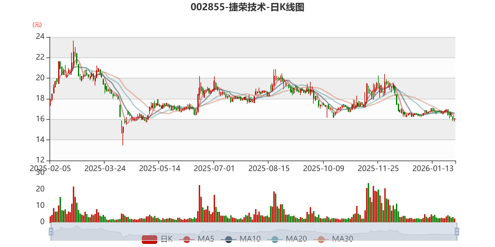 中证智能财讯捷荣技术(002855)1月30日晚间披露2025年度业绩预告,预计2025年归母净利润亏损3.97亿元,上年同期亏损2.98亿元;扣非净利润亏损3.91亿元,上年同期亏损3.05亿元;基本每股收益-1.61元/股。以1月30日收盘价计算,捷荣技术目前市盈率(TTM)约为-9.99倍,市净率(LF)约12.12倍,市销率(TTM)约2.41倍。
