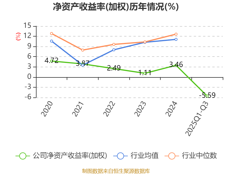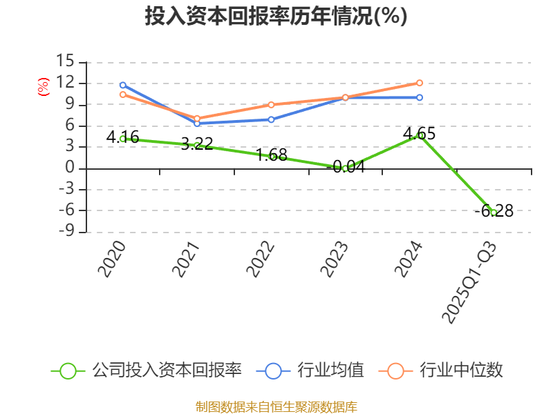 盈利能力方面, 2025年前三季度公司加权平均净资产收益率为-5.59%,同比下降1.4个百分点。公司2025年前三季度投入资本回报率为-6.28%,较上年同期下降1.32个百分点。