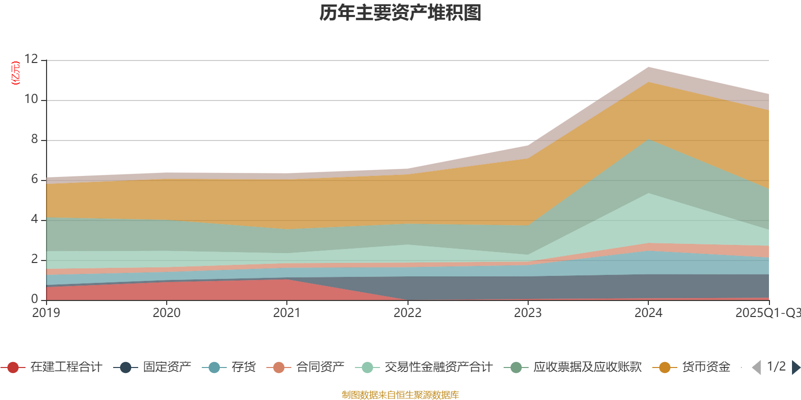 资产重大变化方面,截至2025年三季度末,公司货币资金较上年末增加37.54%,占公司总资产比重上升13.65个百分点;交易性金融资产合计较上年末减少67.9%,占公司总资产比重下降13.63个百分点;应收票据及应收账款较上年末减少24.27%,占公司总资产比重下降3.31个百分点;合同资产较上年末增加52.17%,占公司总资产比重上升2.39个百分点。