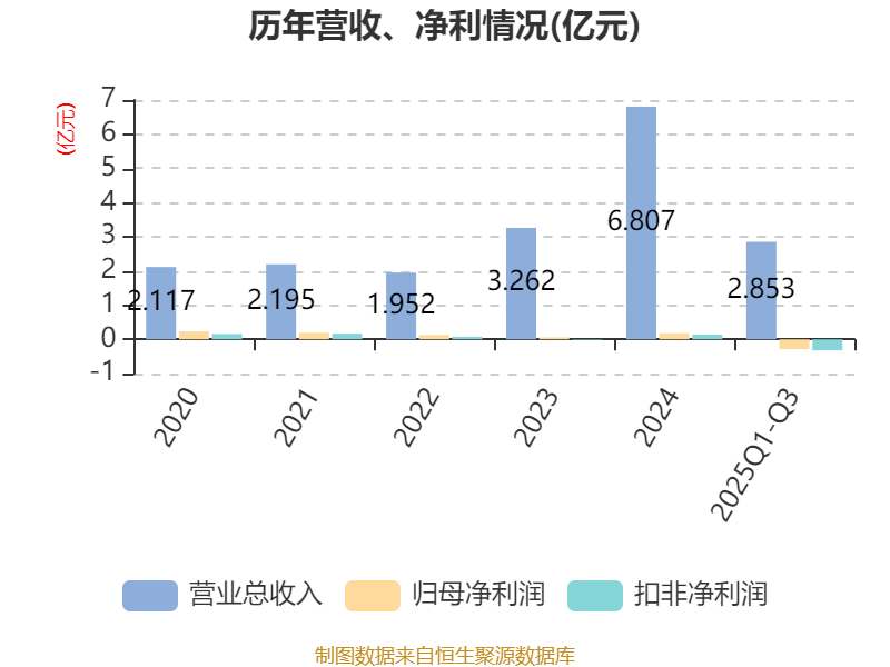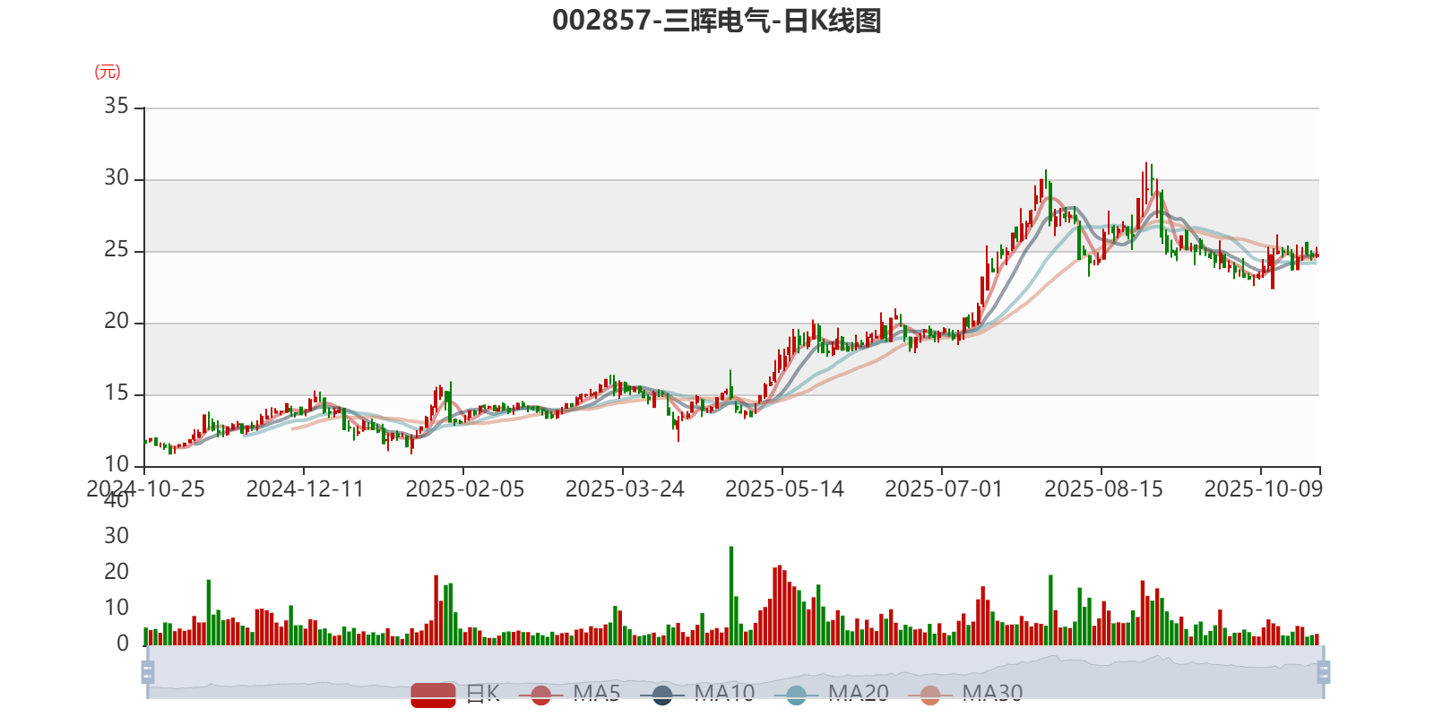 中证智能财讯三晖电气(002857)10月25日披露2025年第三季度报告。前三季度公司实现营业总收入2.85亿元,同比增长79.31%;归母净利润亏损2862.78万元,上年同期亏损2130.2万元;扣非净利润亏损3212.89万元,上年同期亏损2569.83万元;经营活动产生的现金流量净额为-1.1亿元,上年同期为-4620.92万元;报告期内,三晖电气基本每股收益为-0.2216元,加权平均净资产收益率为-5.59%。