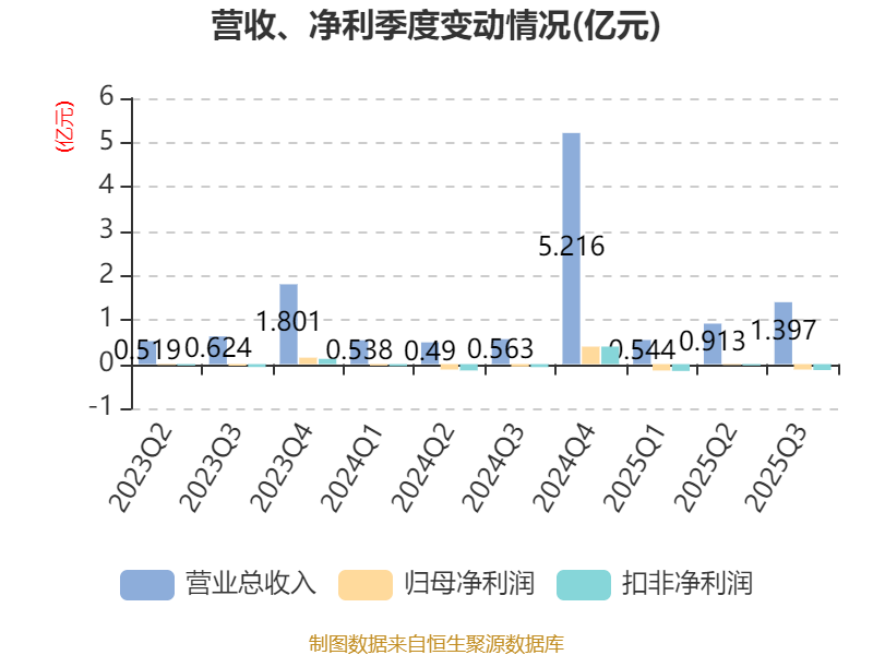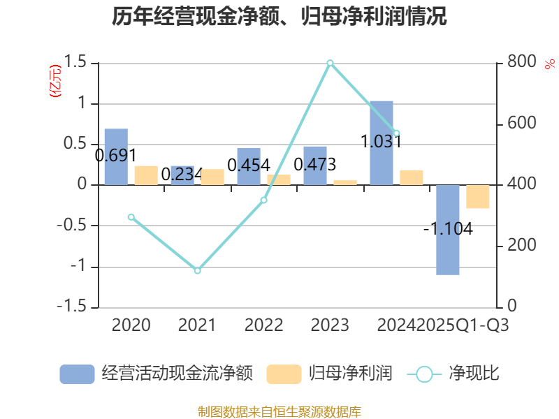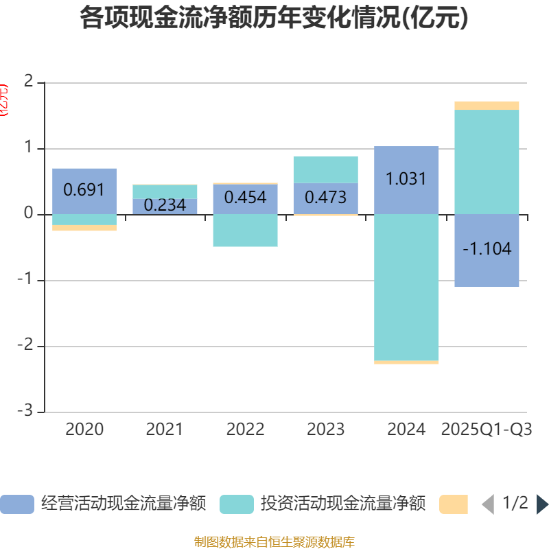 2025年前三季度,公司经营活动现金流净额为-1.1亿元,同比减少6422.59万元;筹资活动现金流净额1266.26万元,同比增加1272.99万元;投资活动现金流净额1.58亿元,上年同期为-9895.43万元。