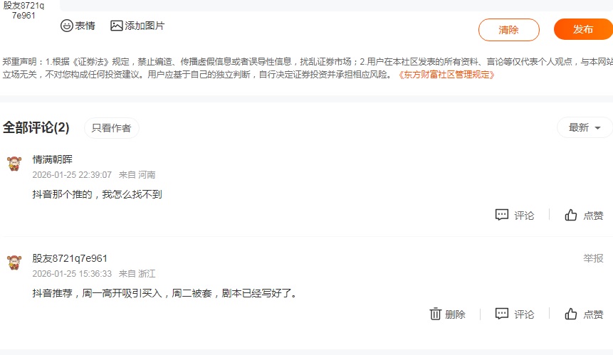 温馨提示: 1.根据《证券法》规定,禁止编造、传播虚假信息或者误导性信息,扰乱证券市场;2.用户在本社区发表的所有资料、言论等仅代表个人观点,与本网站立场无关,不对您构成任何投资建议。用户应基于自己的独立判断,自行决定证券投资并承担相应风险。《东方财富社区管理规定》
