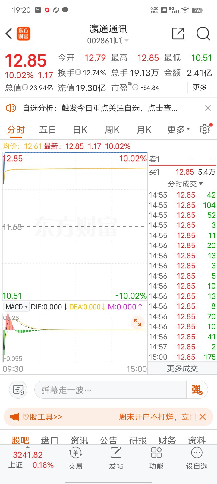 $瀛通通讯(SZ002861)$ 高开9点5最低11元75